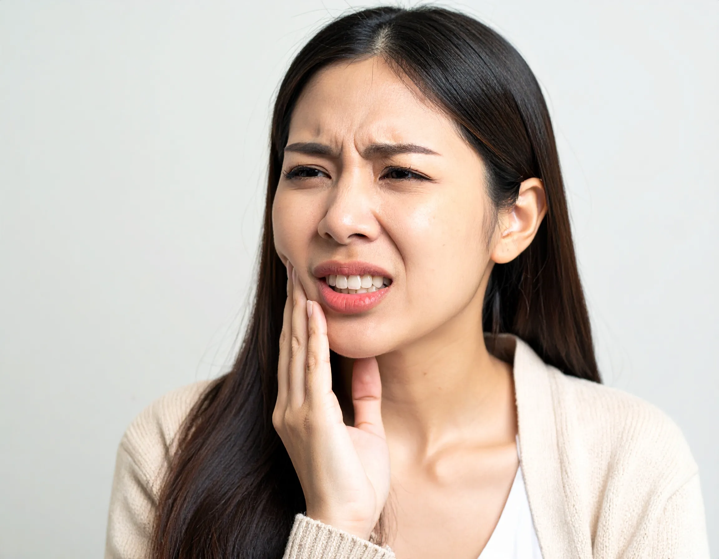 大きくなると顎が腫れたり、顔が非対称になったりすることがあります。顎を押すと硬いしこりを感じることもあります。嚢胞が歯を押すことで歯並びが悪くなることがあり、感染すると痛みや腫れが生じます。